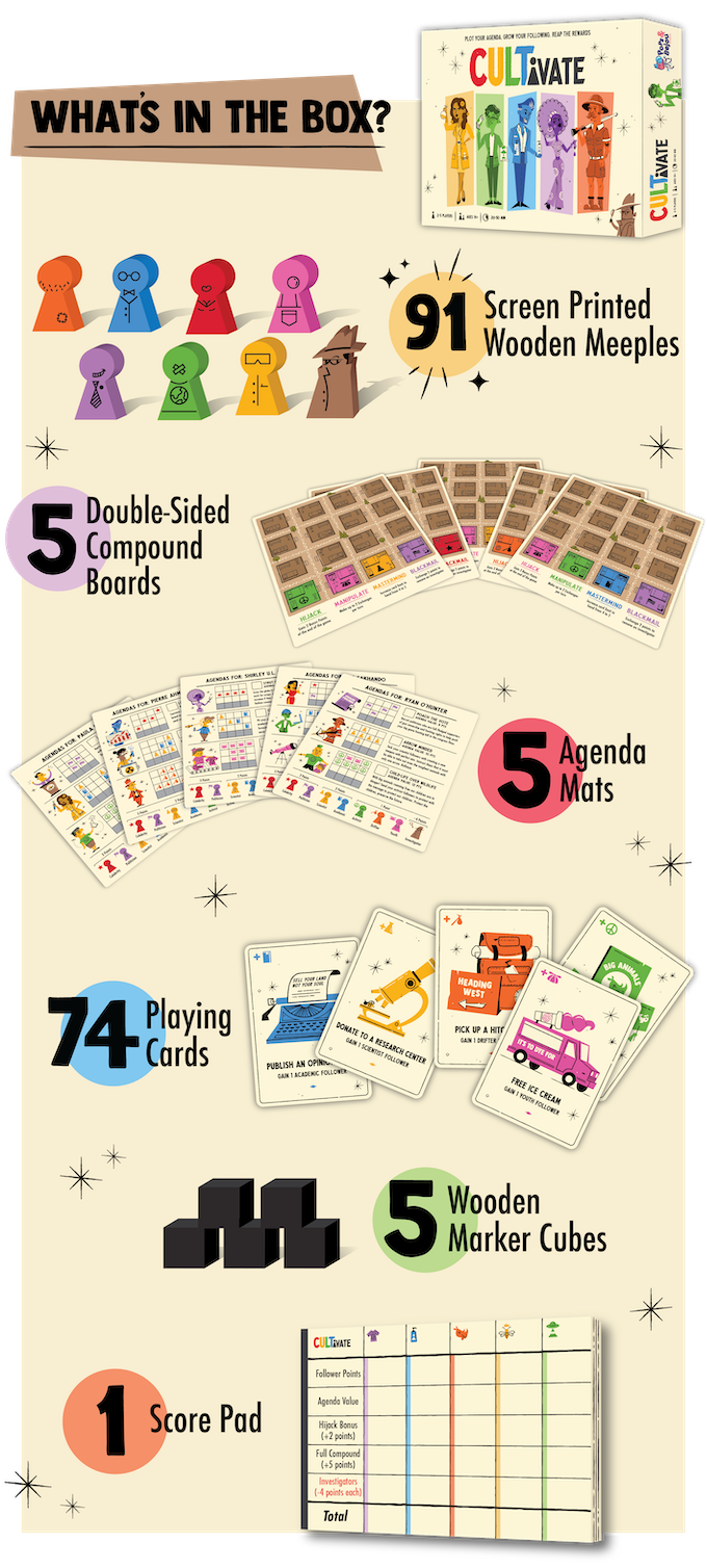 You are a cult leader working to fill your compound with followers who can help you carry out your cult’s agenda. As you cultivate various types of recruits, their unique skills will gain your cult powers to help you fulfill your agenda. But watch out! If you are becoming too powerful, rival cult leaders may try to sabotage you or convert the followers you can’t keep in line. You might also garner unwanted attention and be subjected to an undercover investigation at any time. Persuade the right followers, outwit your foes, and rise above the rest.