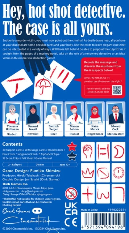 Whether or not their conclusions turn out to be right on the nose or way off the mark depends on their discussions. The satisfying feeling of coming to an agreeable conclusion or the hilarity of misguided deductions and dying messages is sure to bring a smile to your face. An exciting game that's perfect for adults!