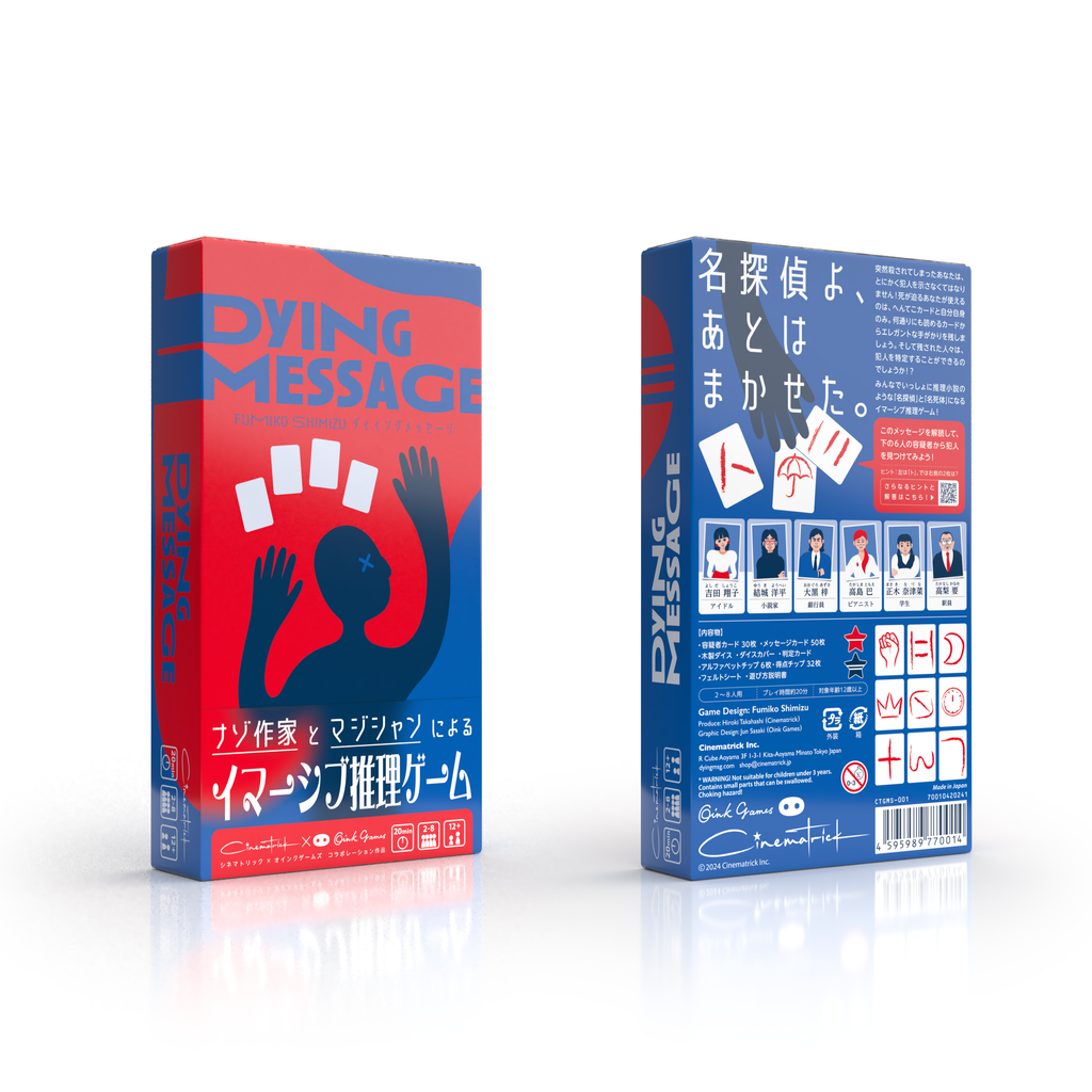 You have just been murdered by someone. As your consciousness fades, you must somehow point out the murderer within the limited time you have left! In front of you are 15 cards that you might be able to use. Upon closer inspection, these cards can be used to represent various things by changing their direction or hiding different parts of them. Not only that, but you yourself can become part of the dying message. Where you point your finger, the meaningful pose that you make...you can use your body for anything that can’t be conveyed by the cards.
