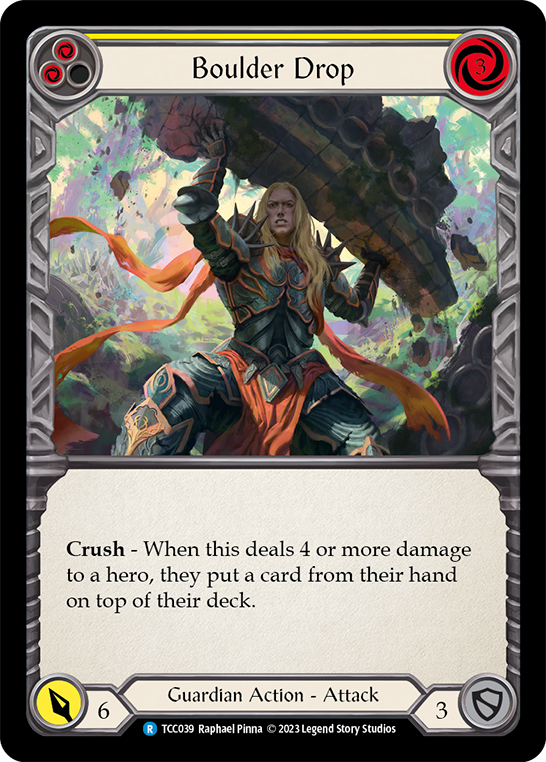 Hurry! Only0units left in stock!Set: Round the Table: TCC x LSS Finish: Regular Type: Action Subtype: Attack Rarity: Rare Class: Guardian Cost: 3 Power: 6 Crush - When this deals 4 or more damage to a hero, they put a card from their hand on top of their deck.English version at the bottom.